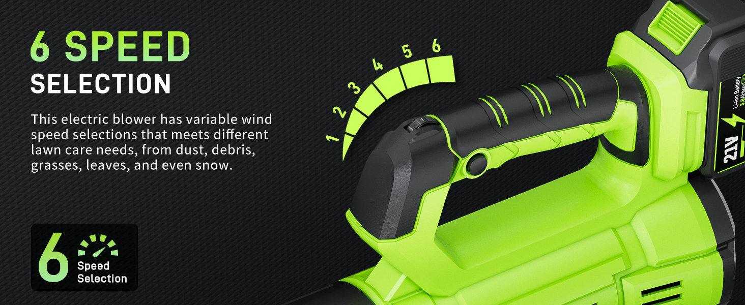 6-Speed Selection: The cordless leaf blower offers versatile power options to effectively blow away dust, leaves, and debris. You can choose the blowing force that best suits your needs for different tasks.
