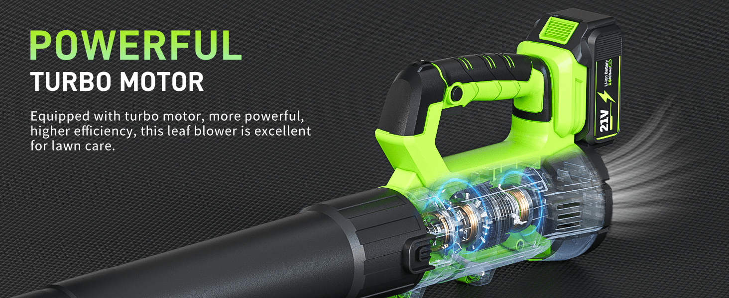 Powerful Turbo Motor: Featuring advanced turbo technology, this electric blower produces a powerful blast of air, effortlessly clearing even the most stubborn messes. It ensures thorough and effective cleaning.