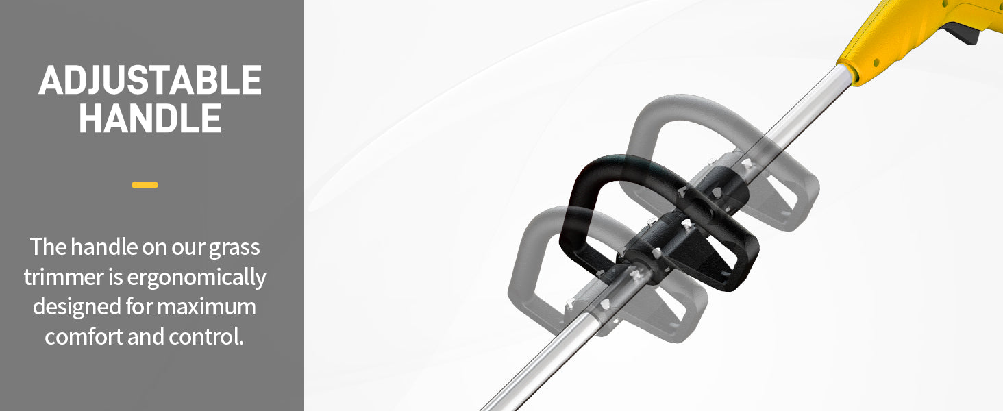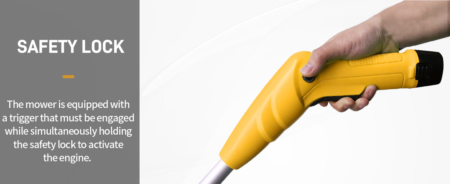 • 【High Power】This battery-powered grass trimmer is equipped with a high-performance motor with a maximum speed of 10,000rpm and sharp blades. The string trimmer is equipped with a double-switch safety lock function, which can effectively avoid the danger caused by accidental activation. You need to hold down the lock button before holding down the trigger to start the weed mower, making your weeding safer and more reliable.