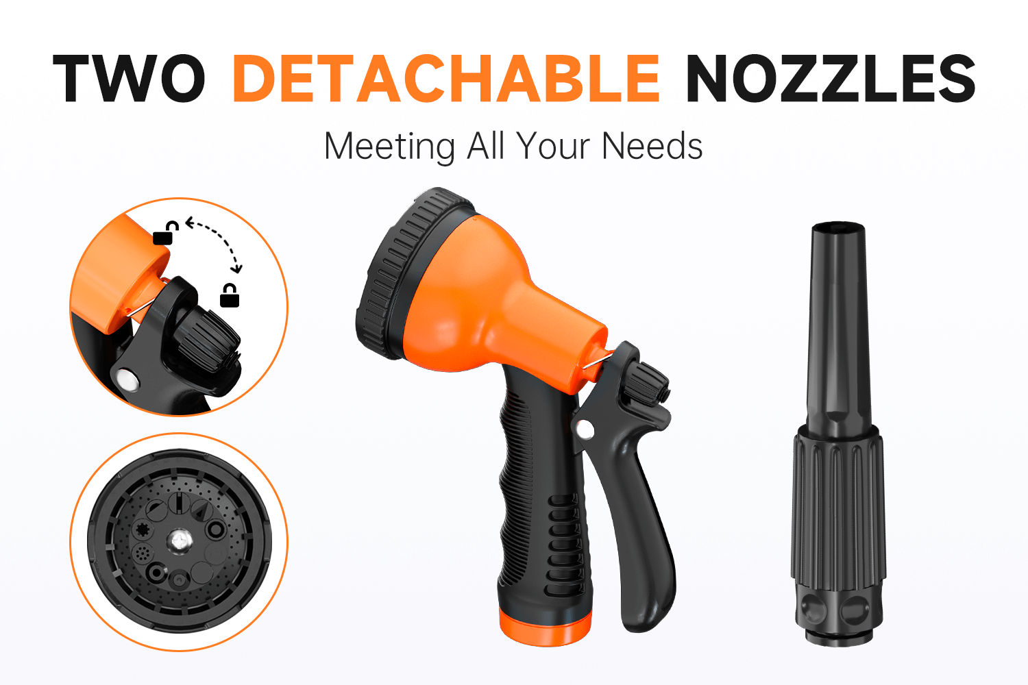The hose reel comes with two nozzles: one with adjustable 10 modes to meet various watering needs, and another with a straight nozzle for precise water flow control.