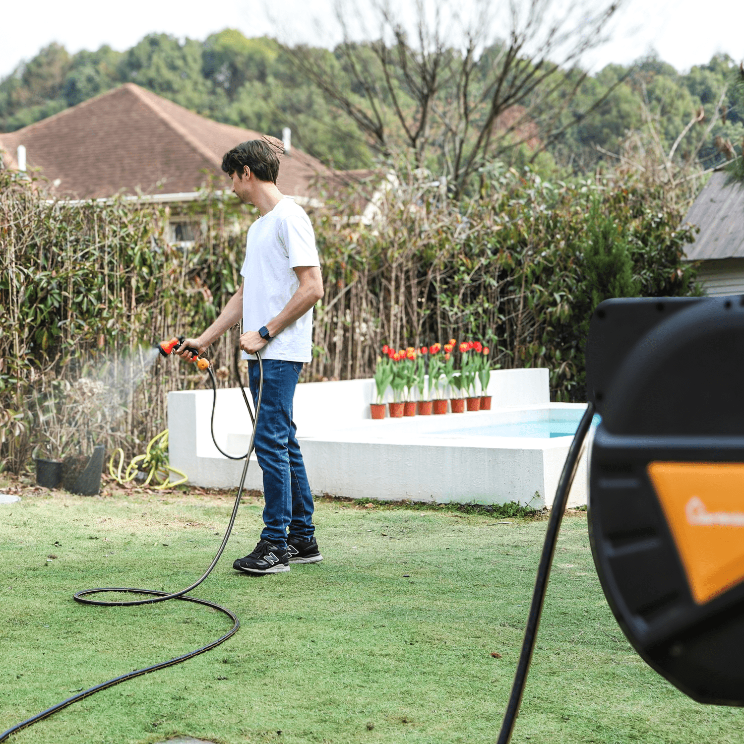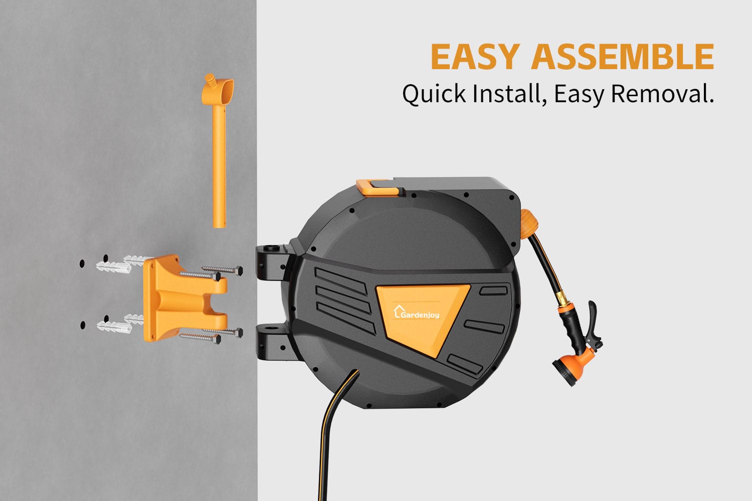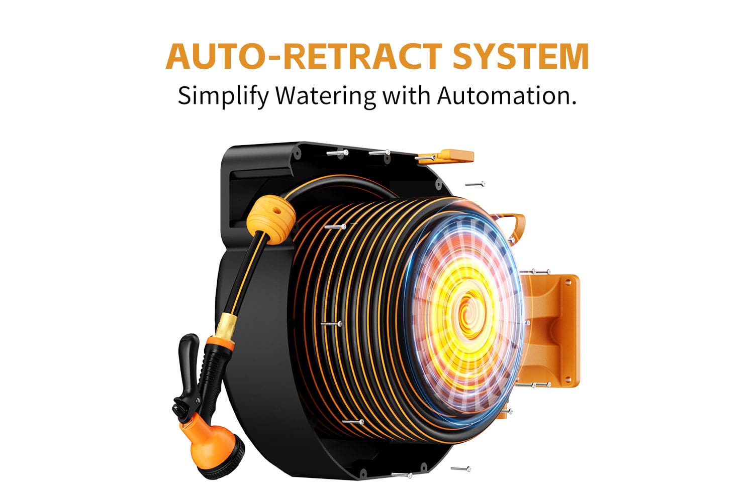 GardenJoy Orange automatic rewind hose, one-touch lock for any length, special leak-proof design, with 10-mode nozzle + 180° rotating bracket