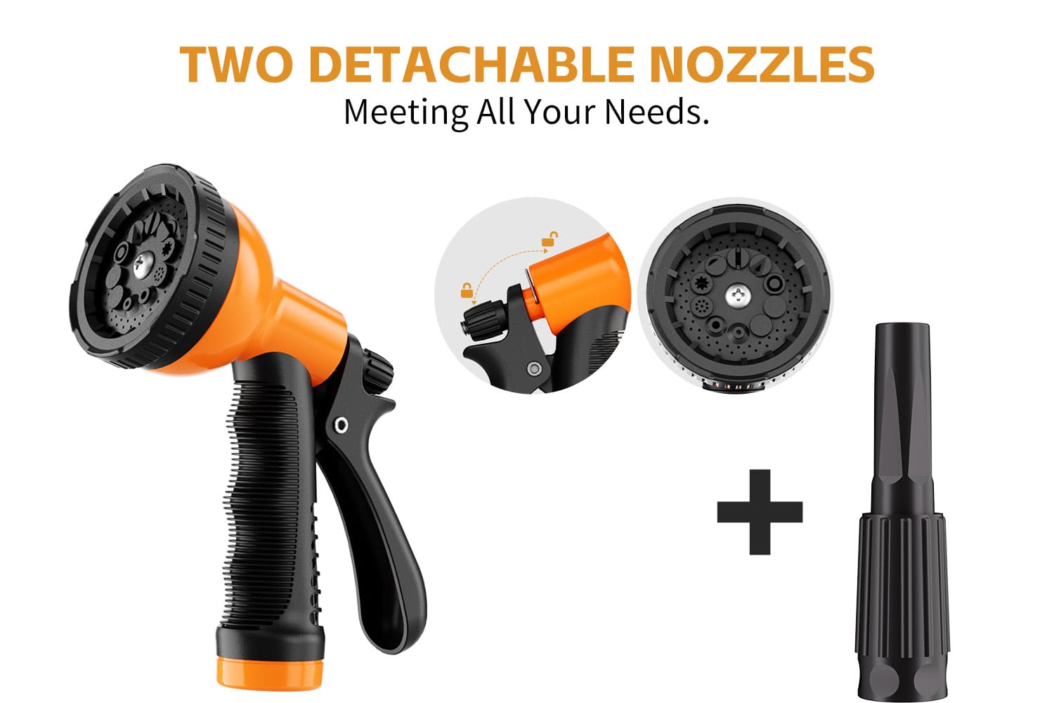 Yes, we provide each retractable hose reel set with two nozzles: a 10-pattern nozzle and a garden hose nozzle. You can freely interchange them based on your needs. If you wish to replace them with nozzles from other brands, just ensure they are the appropriate size. However, we strongly recommend using the original nozzles for optimal performance.