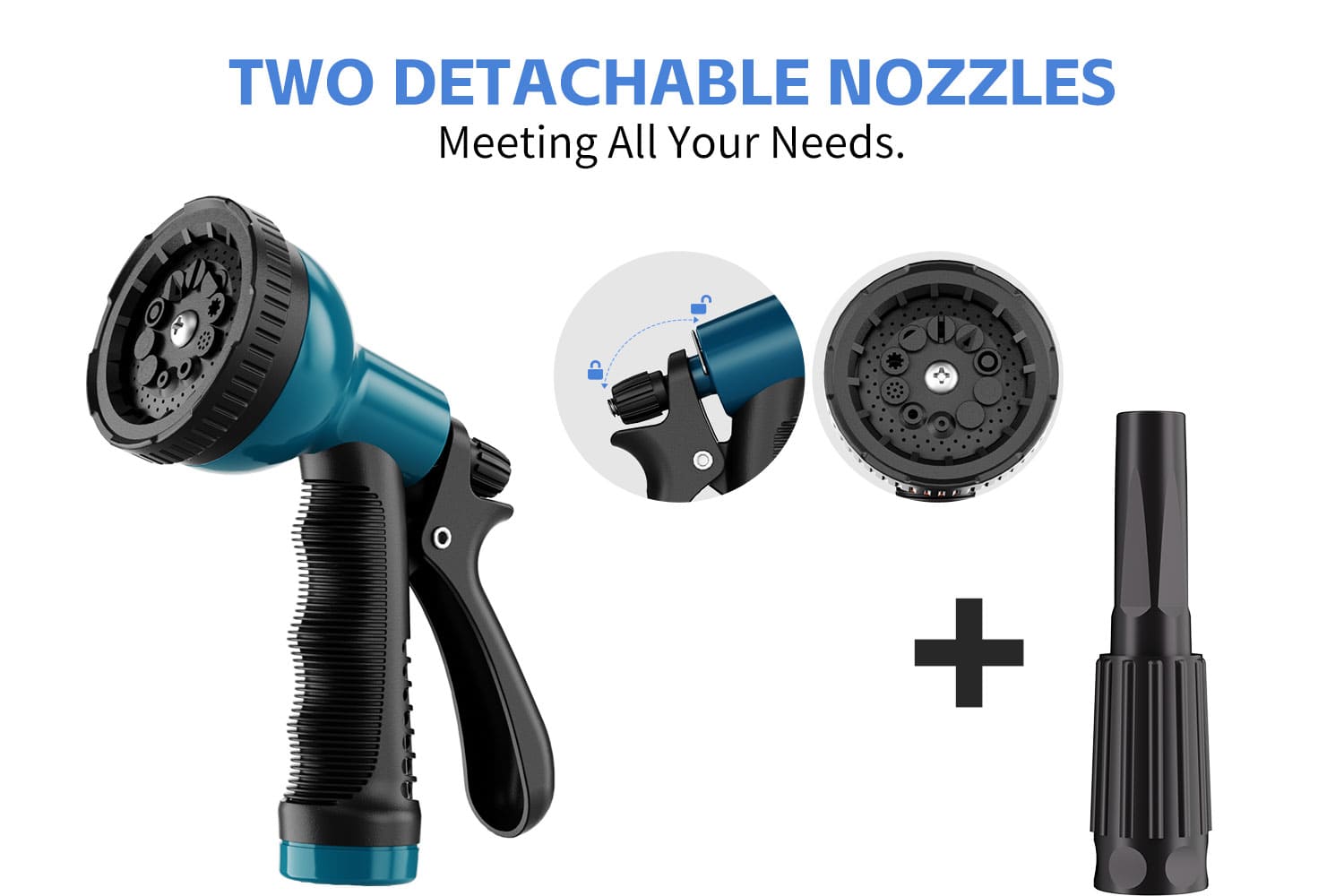 Yes, we provide each retractable hose reel set with two nozzles: a 10-pattern nozzle and a garden hose nozzle. You can freely interchange them based on your needs. If you wish to replace them with nozzles from other brands, just ensure they are the appropriate size. However, we strongly recommend using the original nozzles for optimal performance.