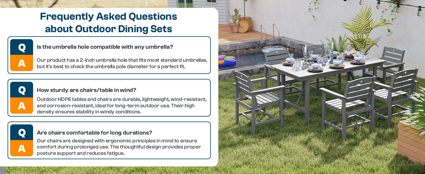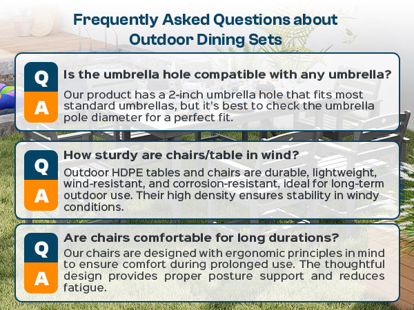 - Weather-Resistant & Durable HDPE Material: Built with high-density polyethylene (HDPE) lumber, this patio table and chairs set withstands rain, snow, strong winds, and salt air, making it ideal for coastal areas. Unlike wood, it resists fading, warping, and cracking—ensuring long-lasting performance with minimal maintenance.