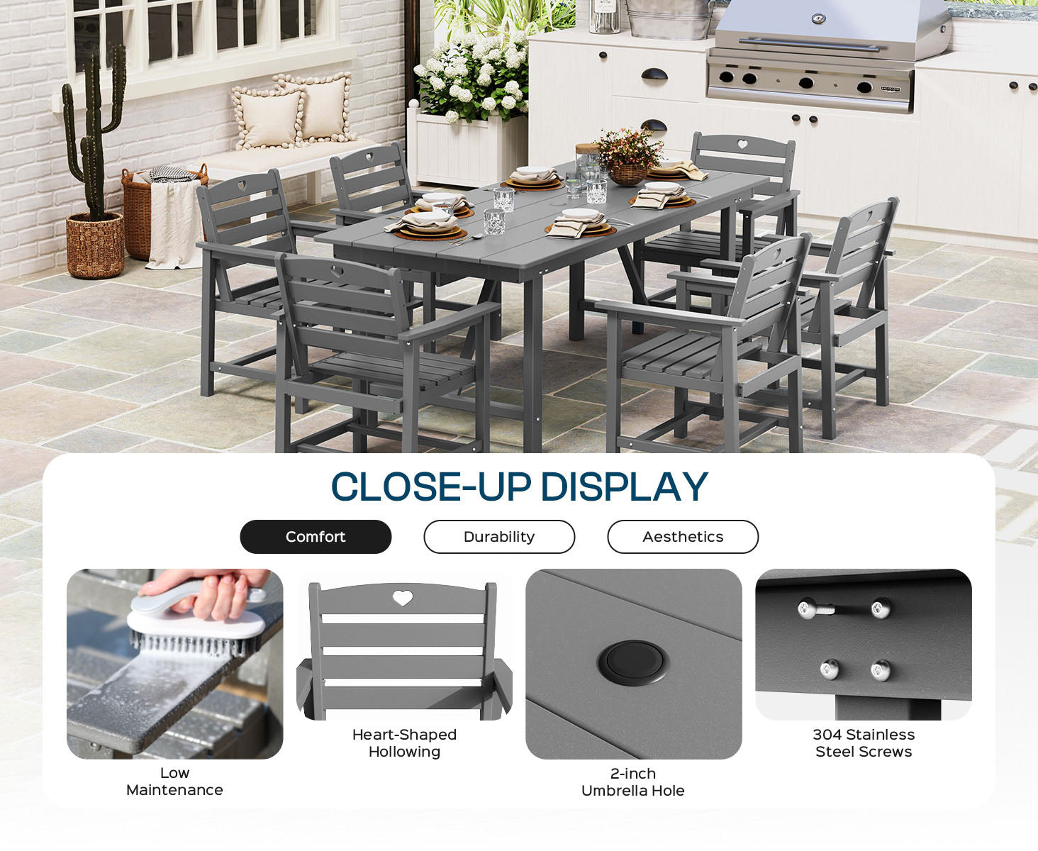 - Functional Tabletop with Umbrella Hole: The patio dining table features a slatted design with an umbrella hole, allowing water drainage while accommodating a patio umbrella for shade. Whether for a patio dining table for 4 or 6, this set is perfect for family meals and social gatherings.