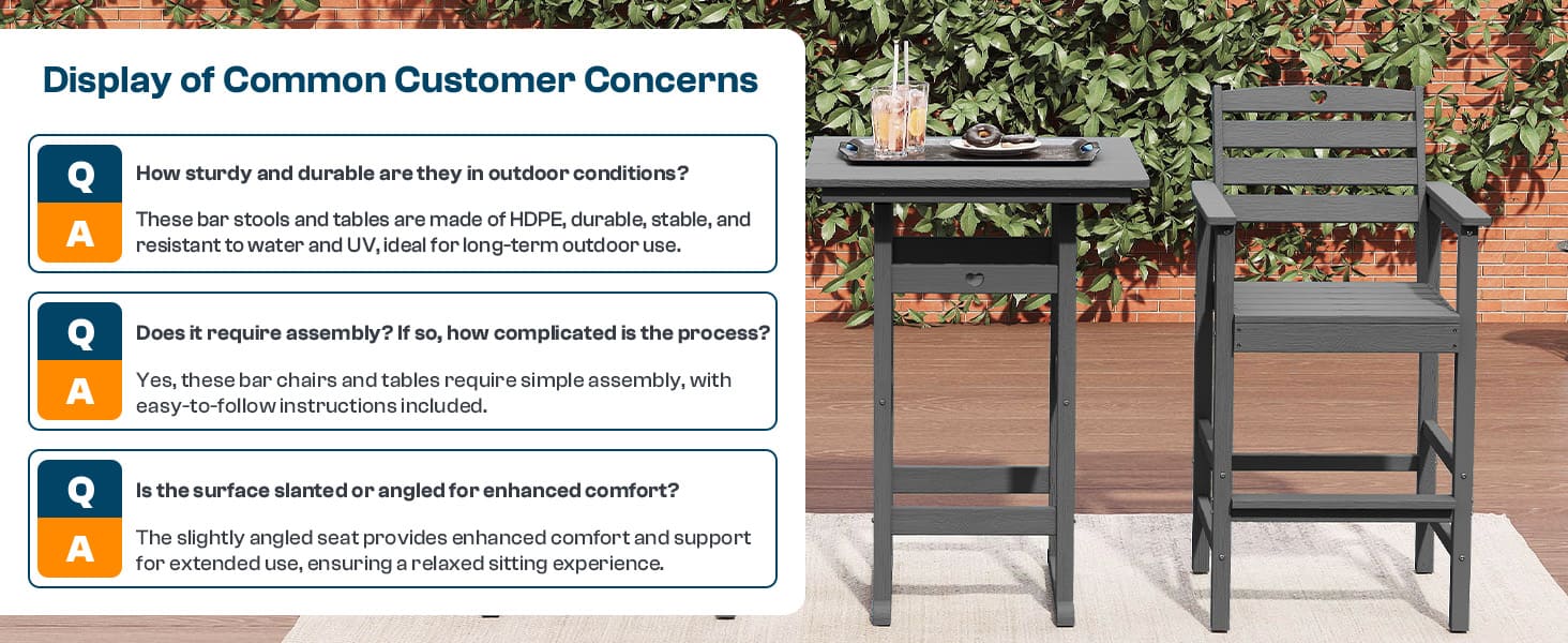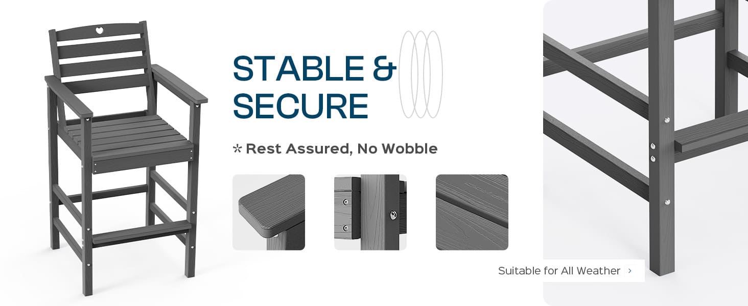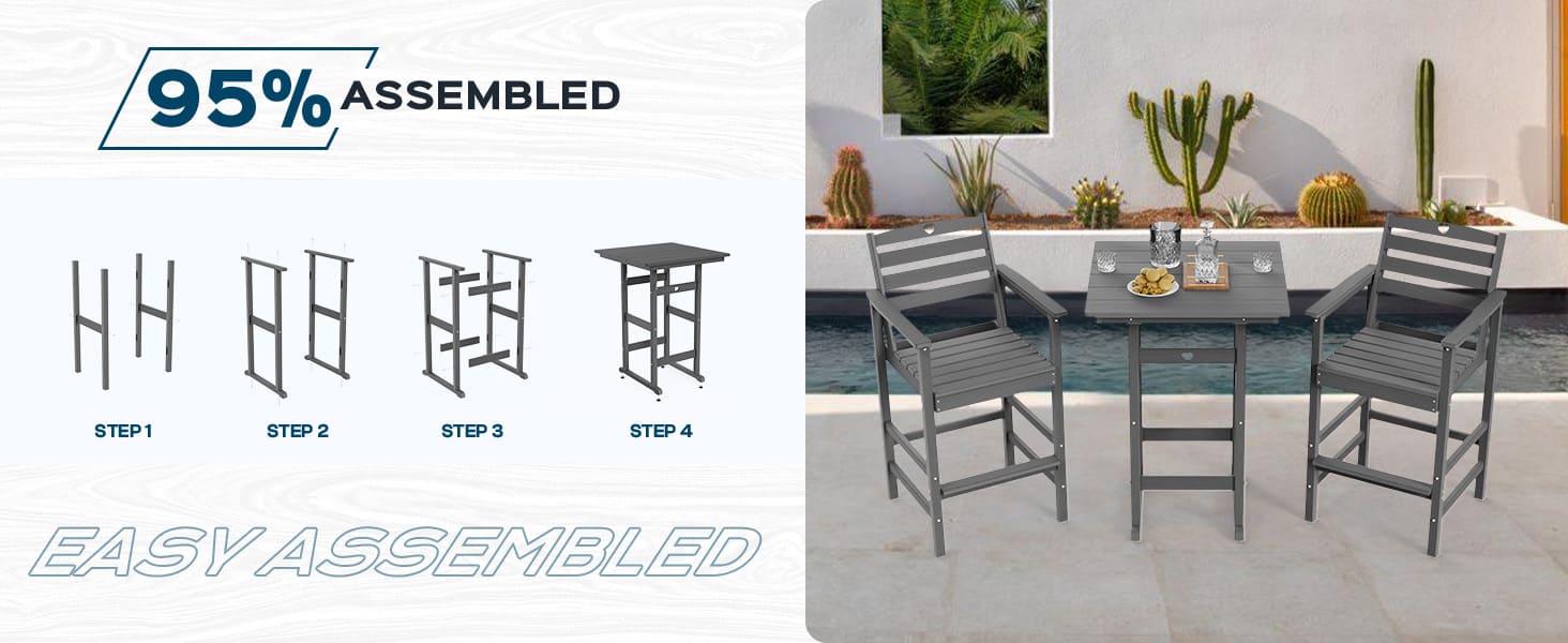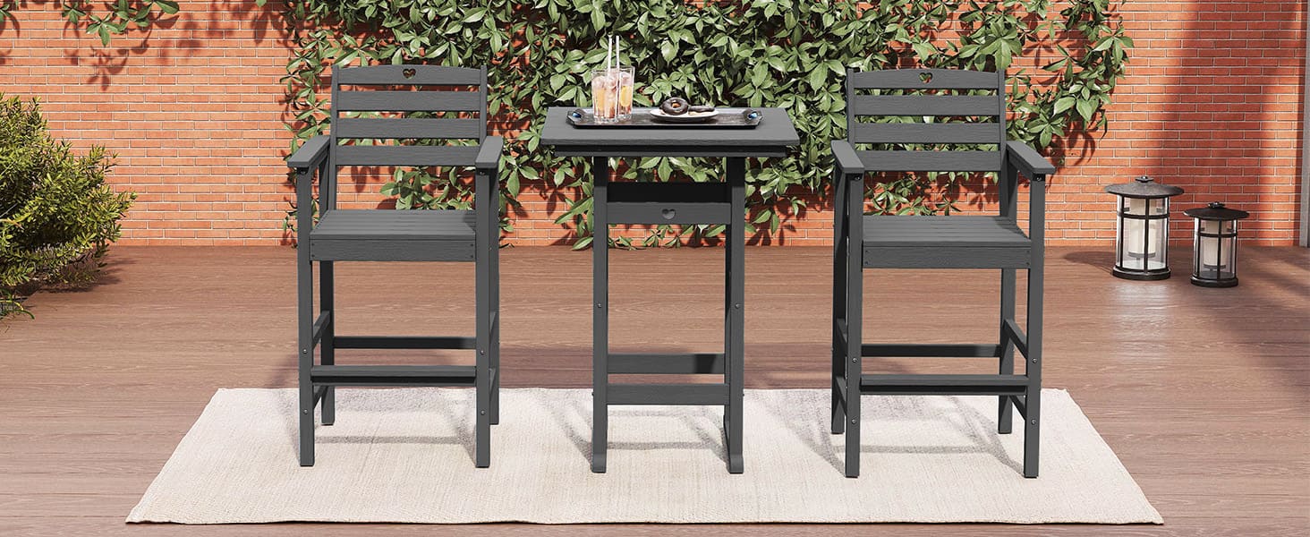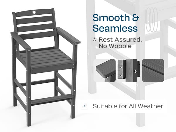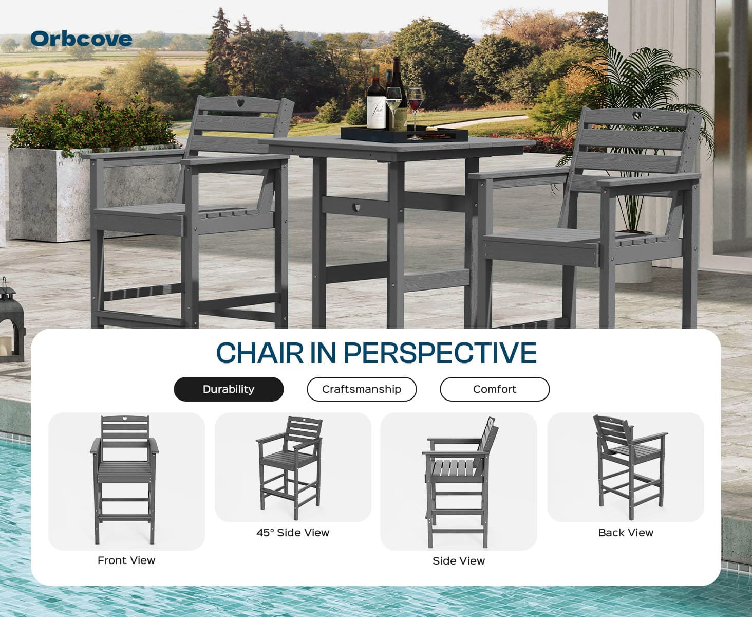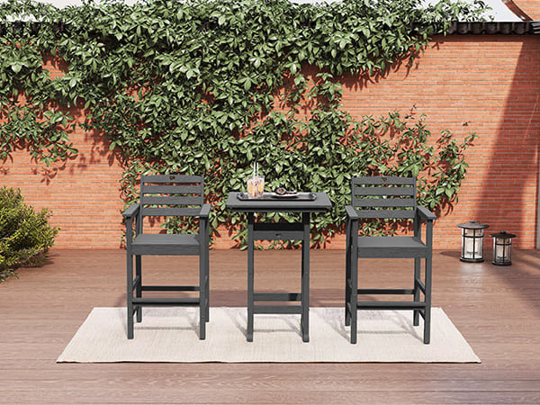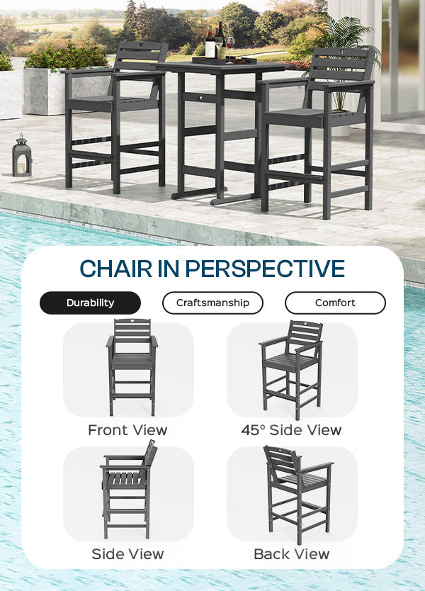 - Durable All-Weather Construction: Crafted from high-density polyethylene (HDPE), this bar table and chair set withstands harsh weather conditions like intense sun, strong winds, and heavy rain while maintaining vibrant color and wood-like texture. No additional covers are required.